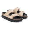 The Arizona is a genuine classic that has been delighting both men and women for decades. Here, Papillio presents the two-strap model with a stylish platform sole with extra deep tread lines. The bevels at the front and back provide for maximum walking comfort. This popular sandal has been given an update in a new material, with a vegan version now available. It is entirely free of animal products, as verified by independent testing laboratories. The upper is made from the skin-friendly, hard-wearing synthetic material Birko-Flor®.