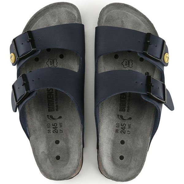 With its high level of comfort and the anatomically shaped original cork-latex footbed, the Arizona two-strap sandal from brand lends itself well to daily occupational use. Thanks to its additional ESD properties to combat spontaneous electrostatic discharge, this model is ideal for wearing in ESD areas. The combination of the footbed and the specially developed sole guarantees permanently gentle discharge and protects sensitive parts. All brand ESD models are tested in accordance with the requirements of EN 61340 and meet the ESD requirements of 1.0 × 105 to 3.5 × 107 ohms.