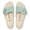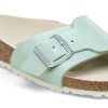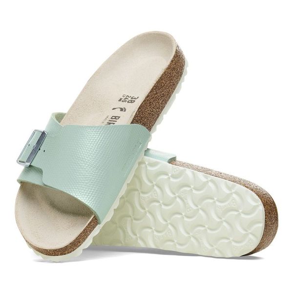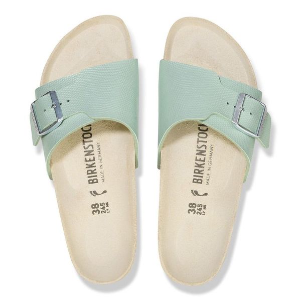 The design of the brand Catalina was inspired by the classic Madrid with a strap and metal buckle. The slightly wider strap lends this sandal a modern elegant appearance. This version comes in a shiny lizard design and exudes elegance and a touch of extravagance thanks to the iridescent metallic foil and the reptile skin look. Inspired by nature, no two shoes have the same look and feel. The upper is made from the skin-friendly, hard-wearing synthetic material Birko-Flor®, which has been embossed.