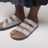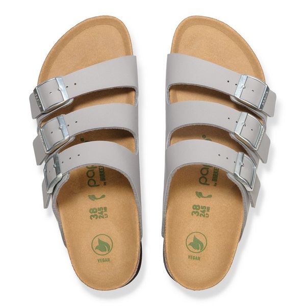 The brand Florida is the ideal sandal for anyone who spends a lot of time on their feet. Here, Papillio presents the three-strap sandal with a trendy platform sole. The new platform flex outsole has a wider heel section for increased stability and ideal weight distribution. This popular sandal has been given an update in a new material, with a vegan version now available. It is entirely free of animal products, as verified by independent testing laboratories. The updated design with horizontal grooves in the front part improves flexibility and the rolling motion. The upper is made from the skin-friendly, hard-wearing synthetic material Birko-Flor®.