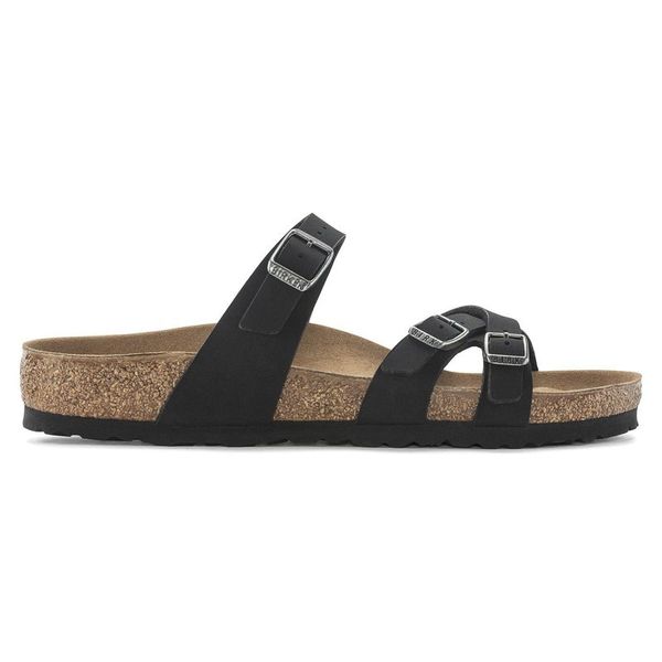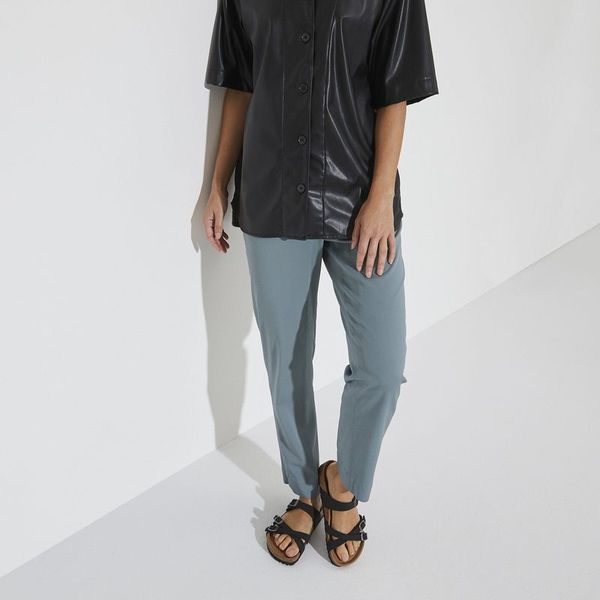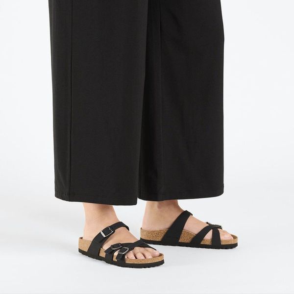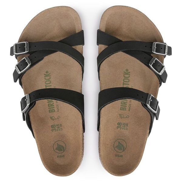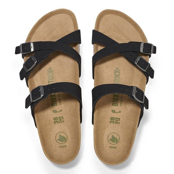 The brand Franca is a jaunty sandal with slim cross-over straps. The impressive combination of design and wearability will see fashion-conscious women through the day with elegance and comfort. This popular sandal has been given an update in a new material, with a vegan version now available. It is entirely free of animal products, as verified by independent testing laboratories. The upper is made from the skin-friendly, hard-wearing synthetic material Birko-Flor® in a sophisticated nubuck look. Here, the sophisticated play with the material gives the classic model a new look which could almost be mistaken for real leather.