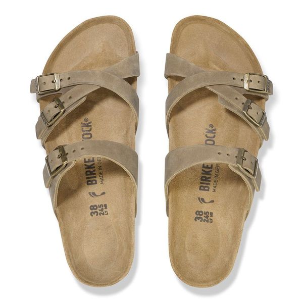 The brand Franca is a jaunty sandal with slim cross-over straps. The impressive combination of design and wearability will see fashion-conscious women through the day with elegance and comfort. The upper is made from extra thick, oiled nubuck leather and features an open-selvage finish.