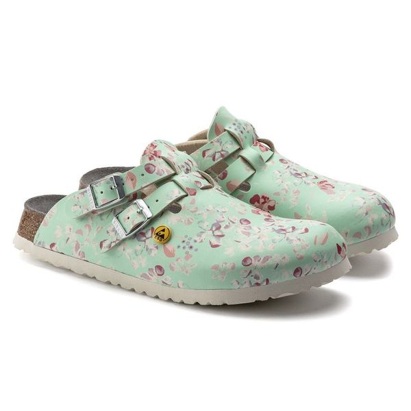 The brand Kay clog boasts two straps, one of which is fixed firmly to the shaft. Thanks to the hidden stud on the side, the second strap can be folded back and, if necessary, can either be worn on the shaft or as an ankle strap for extra grip.This ESD version was developed specifically for people working in microelectronics or with high-frequency technology. ESD stands for “electrostatic discharge”. These shoe models continuously discharge their wearers gently. The antistatic elements in the sole balance out potential differences between the electrical charge of the wearer and their work environment by permanently “grounding” the feet and can be identified by a round, yellow emblem. Warning: the ESD range goes up to values of 34 Mohm and is therefore non-insulating!The upper is made from the skin-friendly, hard-wearing synthetic material Birko-Flor®.The shoe has been tested in accordance with EN ISO 61340.