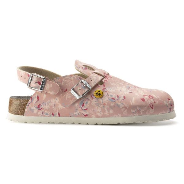 The brand Kay clog boasts two straps, one of which is fixed firmly to the shaft. Thanks to the hidden stud on the side, the second strap can be folded back and, if necessary, can either be worn on the shaft or as an ankle strap for extra grip.This ESD version was developed specifically for people working in microelectronics or with high-frequency technology. ESD stands for “electrostatic discharge”. These shoe models continuously discharge their wearers gently. The antistatic elements in the sole balance out potential differences between the electrical charge of the wearer and their work environment by permanently “grounding” the feet and can be identified by a round, yellow emblem. Warning: the ESD range goes up to values of 34 Mohm and is therefore non-insulating!The upper is made from the skin-friendly, hard-wearing synthetic material Birko-Flor®.The shoe has been tested in accordance with EN ISO 61340.