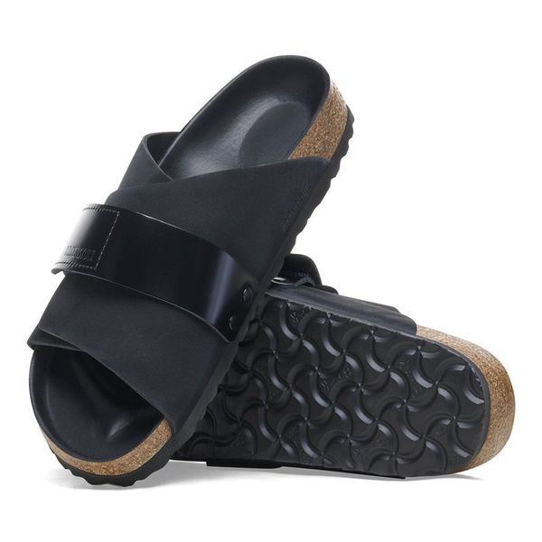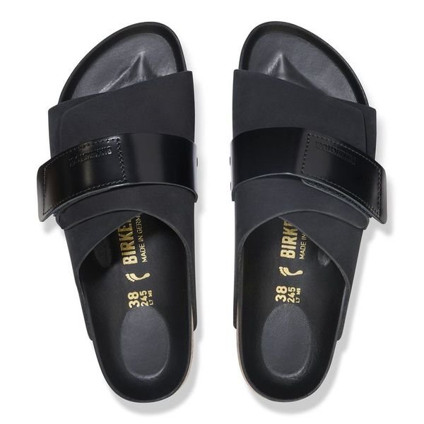 The casual brand Kyoto takes its inspiration from the classic Zürich model and stands out with its compact design and individually adjustable fastener. It offers optimum grip and is complemented by two decorative rivets. The shiny fasteners are sophisticated eye-catchers. The semi-exquisite footbed is fully lined with soft piumato leather, making it exceptionally comfortable. The upper made of soft, high-quality nubuck leather is complemented by accents of shiny patent leather.