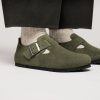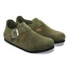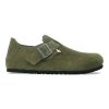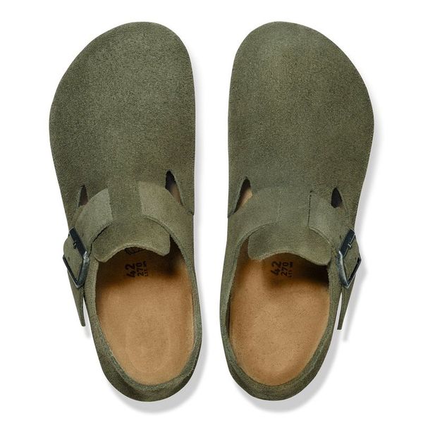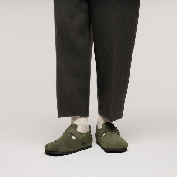 The brand London is a variation on the classic Boston. The raised heel section is characteristic of this simple low shoe with no stitching. It boasts a natural, rustic look and an open-selvage, unlined finish. The color-coordinated buckles with a textile feel and a matte design are additional eye-catchers. The upper is made from especially soft suede which hugs the foot like a second skin.