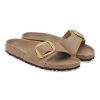 The brand Madrid is a genuine classic that delights the world of fashion with its minimalist design. The Big Buckle version features a large, elegant pin buckle – a fantastic, striking eye-catcher on this otherwise understated sandal. The lining of the semi-exquisite footbed is covered with soft smooth leather and matches the shoe in color. The upper is made from extra thick, oiled nubuck leather with an open-selvage finish.