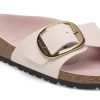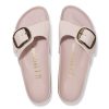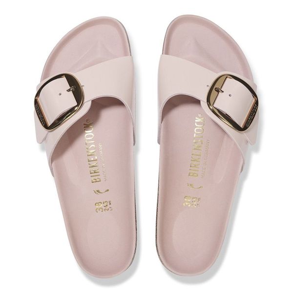 The brand Madrid is a veritable classic that delights the world of fashion with its minimalist design. The Big Buckle version features a large, elegant pin buckle. The semi-exquisite footbed is fully lined with soft piumato leather, making it exceptionally comfortable. The upper is made from high-quality natural leather with a shiny patent coating.