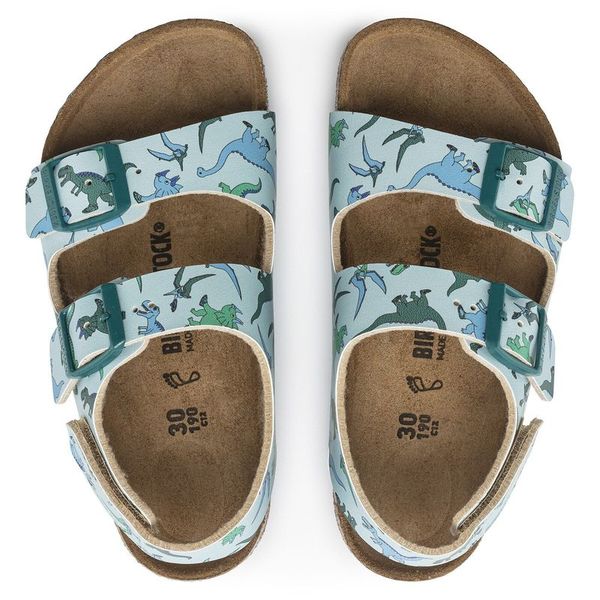 Maximum grip, stability, and a perfect fit! The brand Milano HL boasts perfect functionality. The hook-and-loop fasteners also make those early mornings less stressful with their easy handling. They also ensure that the sandals remain on the feet – also during boisterous play! This version of the sandal will set kids’ hearts racing. The colorful dinosaur print will put a smile on kids’ faces all day long. The color-coordinated details round off the shoe’s look of sophistication. The upper is made from the skin-friendly, hard-wearing synthetic material Birko-Flor®.