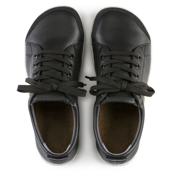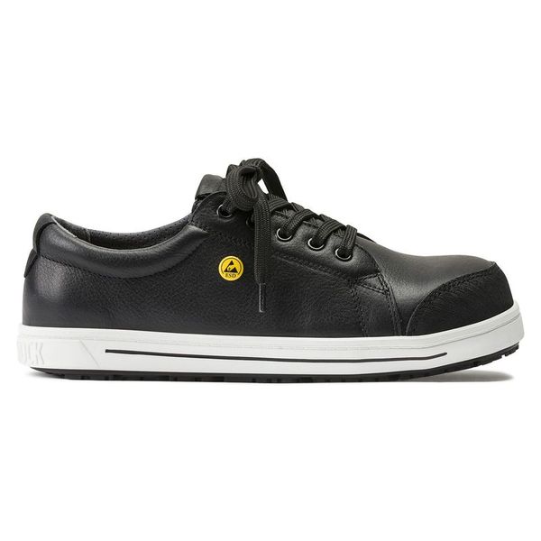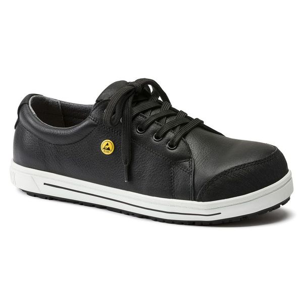 BIRKENSTOCK’s QS500 safety shoe with a removable footbed offers firm grip and takes the strain off your feet, allowing you to stand and move around comfortably at work for many hours, even in demanding environments. The QS500 is presented as a simple, modern sneaker with 6-hole lacing.This ESD version was developed specifically for people working in microelectronics or with high-frequency technology. ESD stands for “electrostatic discharge”. These shoe models continuously discharge their wearers gently. The antistatic elements in the sole balance out potential differences between the electrical charge of the wearer and their work environment by permanently “grounding” the feet and can be identified by a round, yellow emblem. Warning: the ESD range goes up to values of 35 Mohm and is therefore non-insulating!The nonslip, metal-free, and oil- and petrol-resistant outsole additionally provides for energy absorption around the heel and is penetration-resistant. A 200-joule steel toe with a scratch-resistant toe cap protects the forefoot. The upper is made from water-resistant smooth leather (WRU) and offers antistatic protection.The shoe is certified in accordance with EN ISO 20345:2011 and meets the requirements of protection category S3.